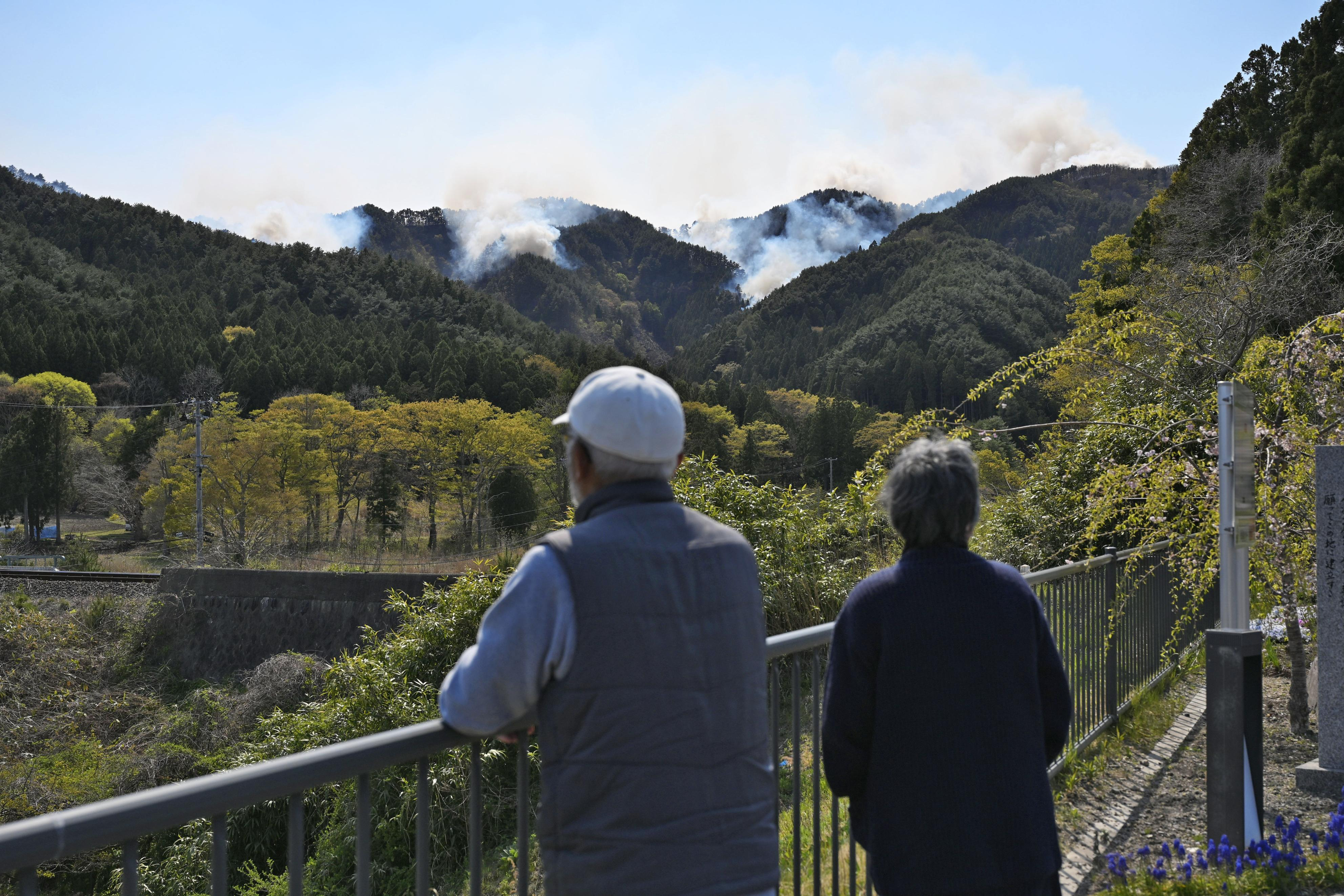 4月24日,当地民众在日本岩手县大槌町遥望远处的山林火灾。